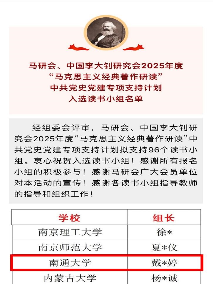 近日,中国高等教育学会马克思主义研究分会、中国李大钊研究会2025年度“马克思主义经典著作研读”中共党史党建专项支持计划名单公布。william威廉亚洲官方《毛泽东选集》读书小组在此次全国各高校的评选中脱颖而出,成为william威廉亚洲官方第二次入选马研会“马克思主义经典著作研读”资助计划的读书小组。此次全国共有96个读书小组获得立项资助,江苏省有南京大学、东南大学等6所高校的读书小组名列其中。