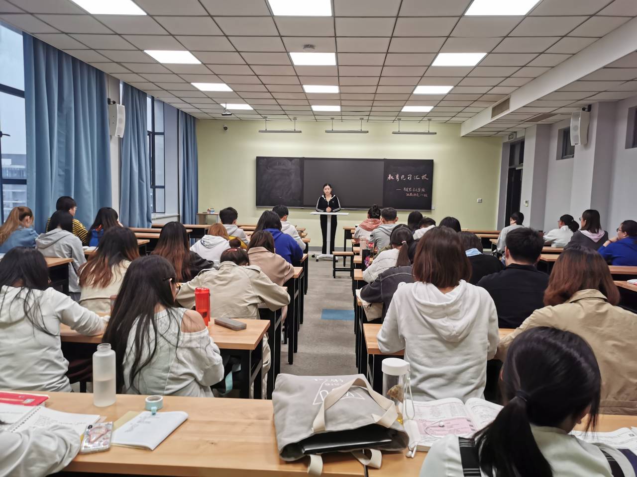 活动伊始,主持人周慧敏简单介绍本次汇报规则后,六组教育见习小组分别派两名同学作为代表,总共十四名同学相继上台完成本小组的口语表达训练的成果汇报。汇报过程中,多数同学做到了表达从容不迫、游刃有余,现场不时响起热烈的掌声。汇报结束后,董老师对同学的表现进行了细致点评,肯定了大部分同学的表达内容论证充分、有逻辑性,也指出有些同学存在语速过快,动作稍显僵硬的问题,鼓励17级师范生勤加练习,不断进步。